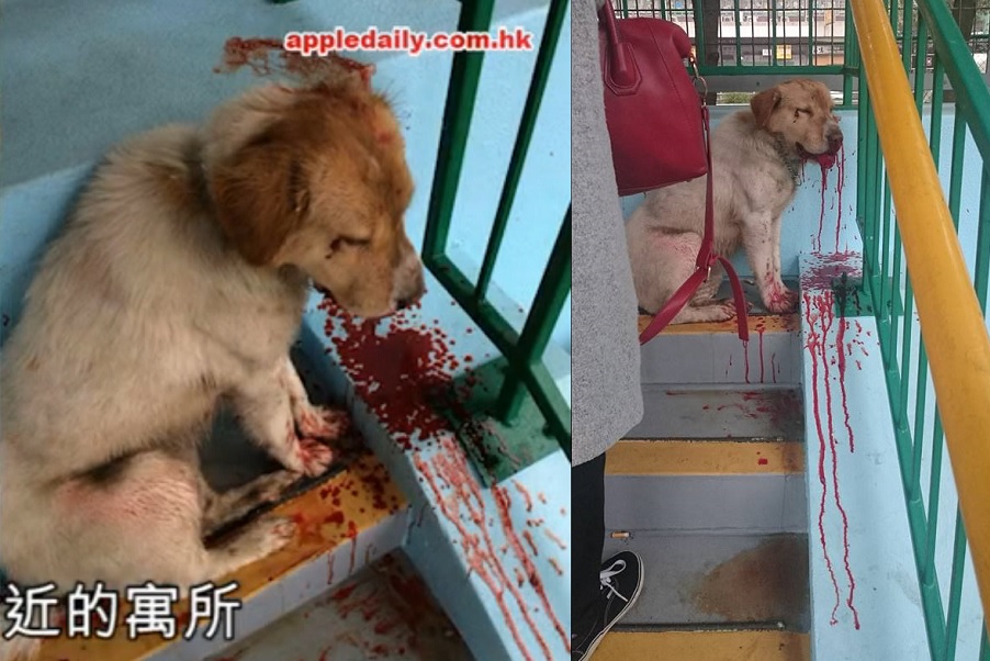 Leung says that the dog then ran over to the seats at San Wo Lane Playground, leaving a blood trail of over 100 metres. She added that the dog was bleeding from its right eye, had broken blood vessels in its left eye, and was vomiting blood profusely.