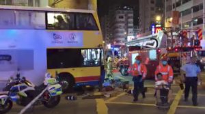 The accident in Hong Kong’s Sham Shui Po district, which killed three and injured 29, occurred at about 6pm when the double decker bus jumped the curb and plowed into a railing and overhanging building canopy where a group of pedestrians was standing.