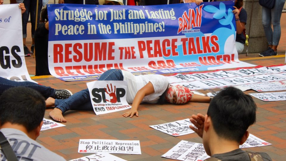 While speakers shared a microphone, decried the strongman leader and led intermittent chants, two women lay motionless on the ground with bloody bandages wrapped around their heads, a symbol of the thousands of extra judicial killings at the hands of Philippine state security forces implementing the president’s ruthless drug crackdown.