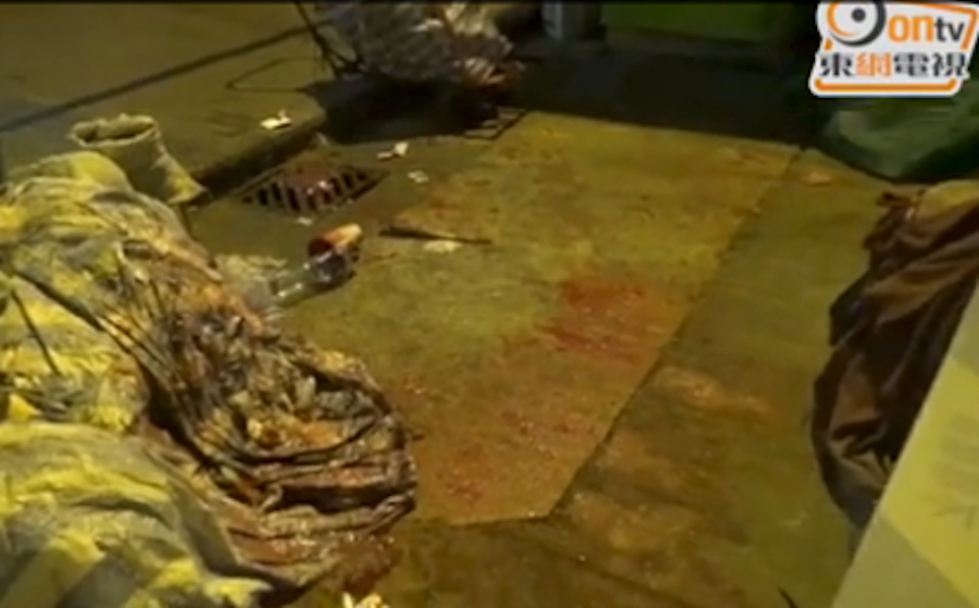 At 1:10 am today a woman surnamed Diu was pushing a cart along Ap Liu Street in Sham Shui Po to set up her street stall. Suddenly, an unidentified man, dressed in all black, spashed a paper cup of red paint onto her, covering her chest and face.