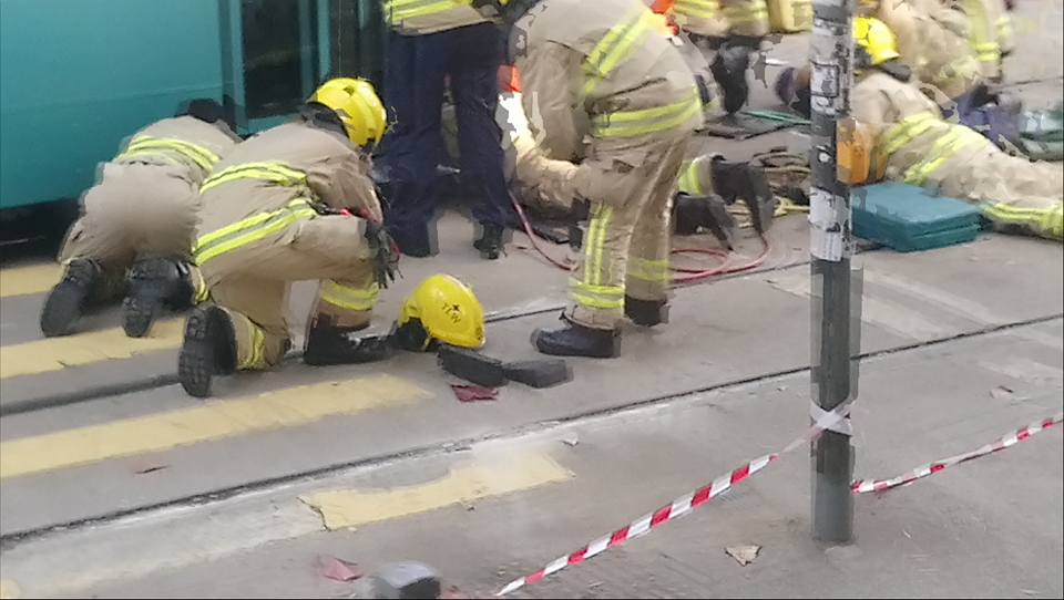Emergency services this morning rescued an elderly woman who was hit by a tram and trapped underneath it.