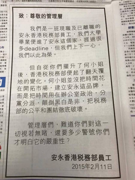 A group of former and current employees allegedly paid for an ad in Apple Daily to write an open letter about to the company about the head of the tax department, a certain “Miss Ho”, who they accuse of “playing office politics”, dividing the company and not accomplishing anything.