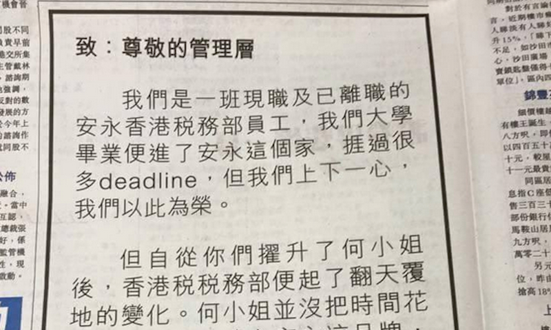 A group of former and current employees allegedly paid for an ad in Apple Daily to write an open letter about to the company about the head of the tax department, a certain “Miss Ho”, who they accuse of “playing office politics”, dividing the company and not accomplishing anything.