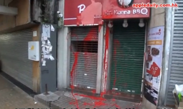 About two hours later at 5am, a one-month-old bar located on 144 Austin Road in Tsim Sha Tsui was also splashed with red paint. The Korean fried chicken joint next door unfortunately suffered some collateral damage as well.