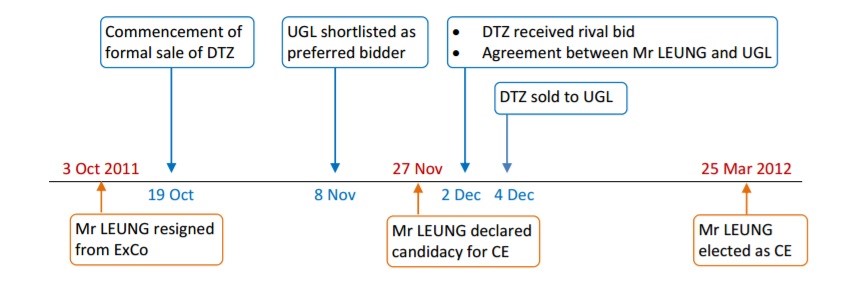 - The nature of the payment: Some lawmakers have called the payments an “illicit kickback” in return for Leung’s support of UGL’s acquisition of DTZ. As Leung had agreed to provide assistance to UGL and received the payments while in office, it prompted concern that he had engaged in a “part-time job” during his tenure as the CE. Lawmakers also questioned why the agreement was made privately and not declared in the main merger and acquisition contract, as per convention.
