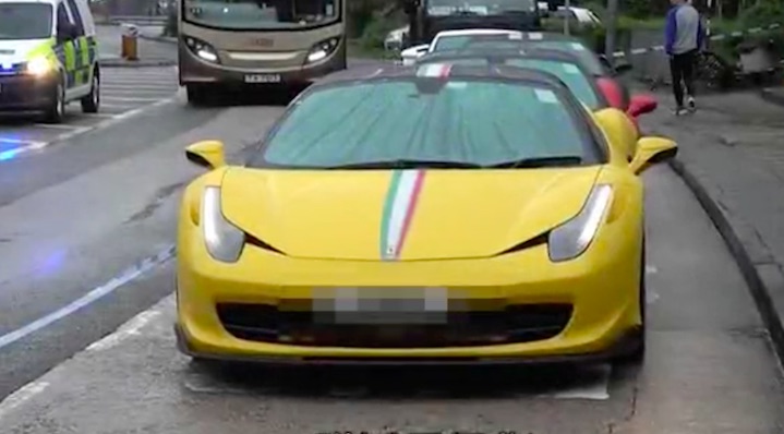 Apple Daily reports that the yellow Ferrari is owned by a 51-year-old businessman surnamed Leung, who is also one of the suspects. The vehicle was purchased in 2011 under the name of a construction company in which Leung is the sole shareholder.