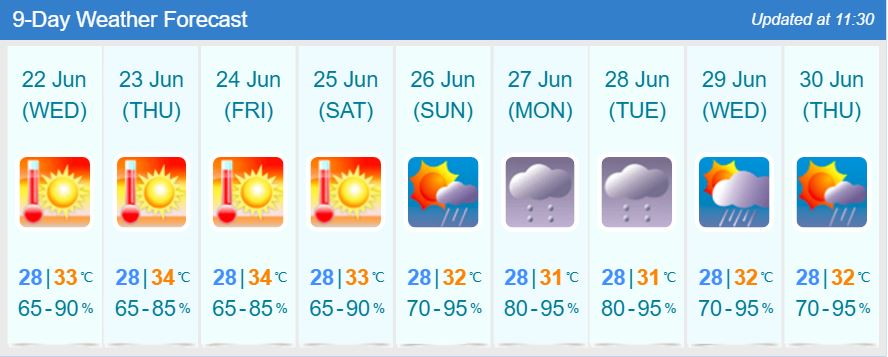 Temperatures are forecast to peak at 34 degrees Celsius on Thursday and Friday, while humidity is expected to stay low (well, for Hong Kong), ranging between 60 percent to 90 percent until Sunday.