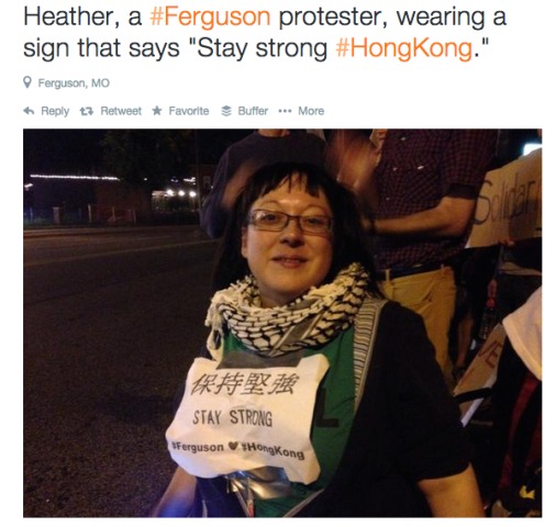 They may be thousands of miles away and protesting over something completely different, but people on the streets of Ferguson, Missouri, are showing their support for Hong Kong’s democracy campaign. Cheers guys!