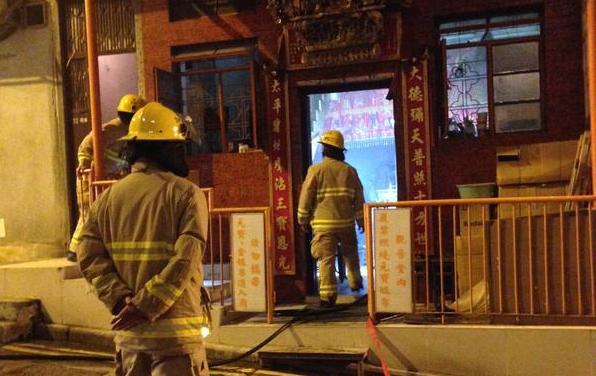 At around 8:30pm last night, Tai Ping Shan Street was filled with police and firefighters as water was pumped into the small temple.