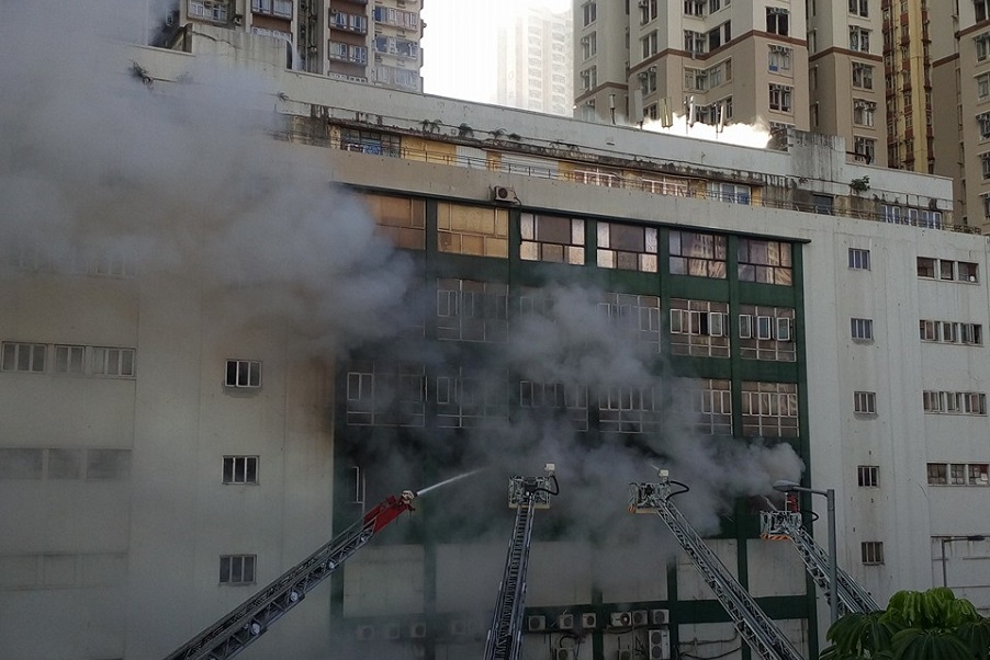 The blaze, which began late yesterday morning, is now contained to the third floor of Amoycan Industrial Centre, where it ignited. The building is 66 years old and was not fitted with a sprinkler system, which is not required for older buildings under current regulations, reports SCMP.