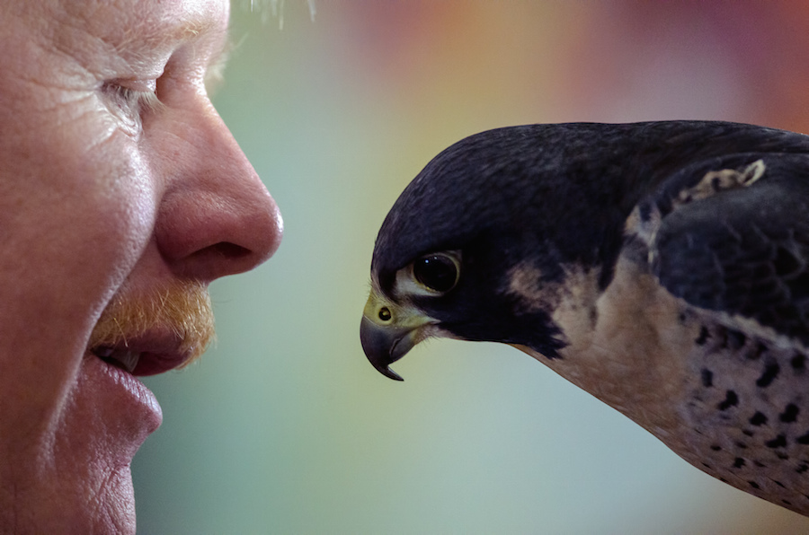 A captive peregrine falcon with its owner in Canada. (Photo: Brent Eades via Flickr)