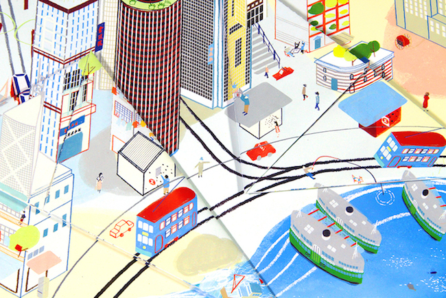 While there are some easily recognisable elements of Chheng’s cityscape – such as the Hopewell Centre, the Peak Tram, the Fringe Club and the Star Ferry – the graphic designer insists the scene is in fact only a loose representation of the Fragrant Harbour, a amalgamation of both her and her mother’s memories.