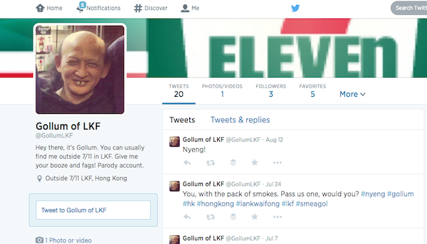 Using the handle @GollumLKF and the tagline “Hey there, it’s Gollum. You can usually find me outside 7/11 in LKF. Give me your booze and fags!”, the account only has three followers and a handful of Tweets to its name.