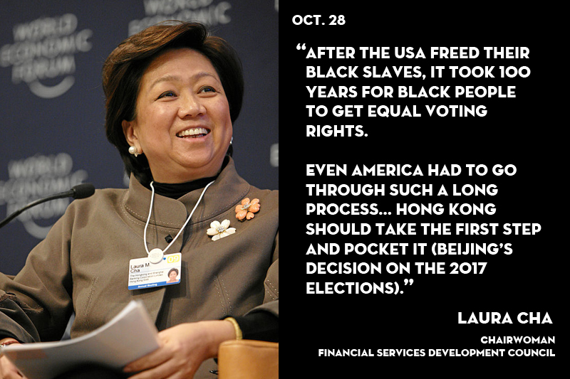 Laura Cha, a non-official member of the Executive Council, compared Hong Kong pro-democracy activists’ fight for democracy to the African-American civil rights struggle on Tuesday.