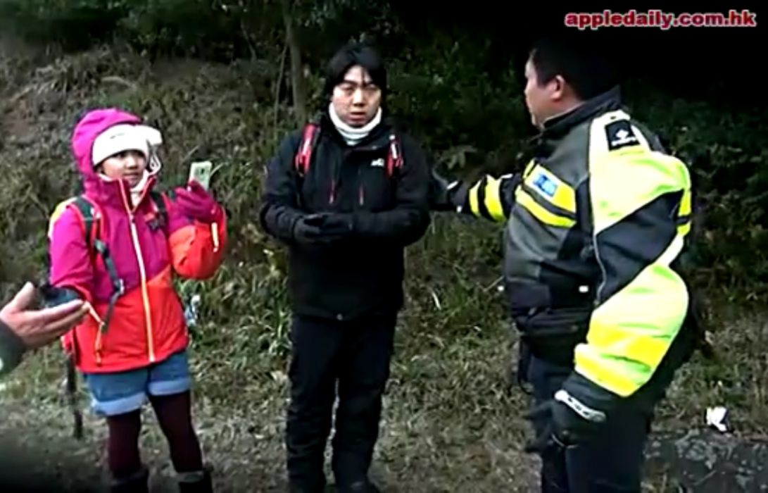 The clip, which appears to have originated from Apple Daily, shows the woman’s reaction when police officers cordoned off the path to Tai Mo Shan.