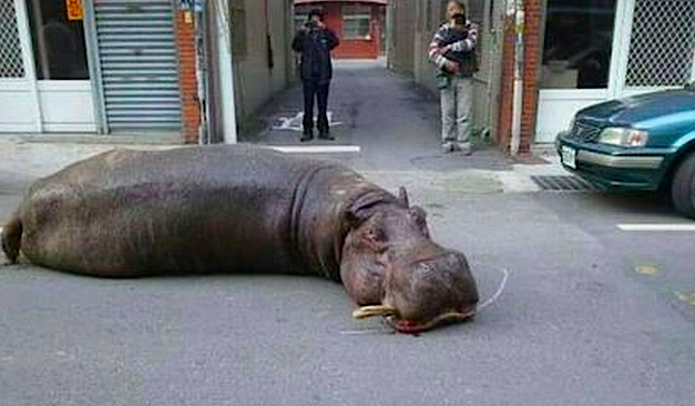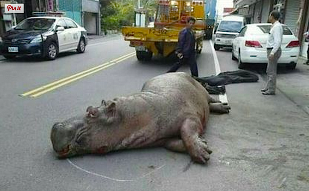 We don’t normally report on stories from Taiwan, but when a two-metre long hippopotamus jumps out of a moving truck, collides with a parked car and lays in the road with its teeth knocked out and tears flowing from its eyes, we make an exception.