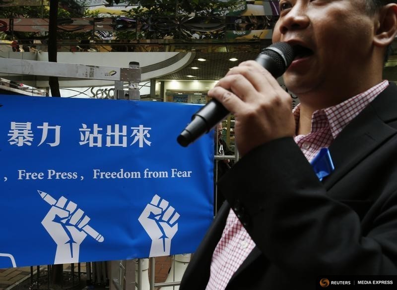 A newspaper columnist urges passersby to support stabbed former Ming Pao chief editor Kevin Lau in Hong Kong on Feb. 28, 2014. (Photo: Reuters)