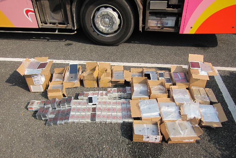 In their subsequent investigation, customs officials searched two more coaches and two vans, finding another HKD11 million worth of electronics, including 1,269 phones and 1,397 tablets.