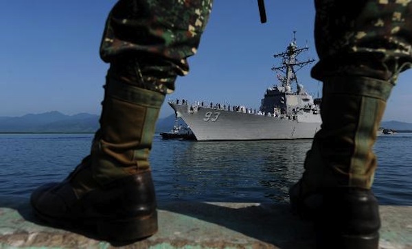 A Philippine naval officer stands guard during the arrival of missile destroyer USS Chung Hoon before a US-Philippine joint naval military exercise near the disputed Spratly islands on June 28, 2011