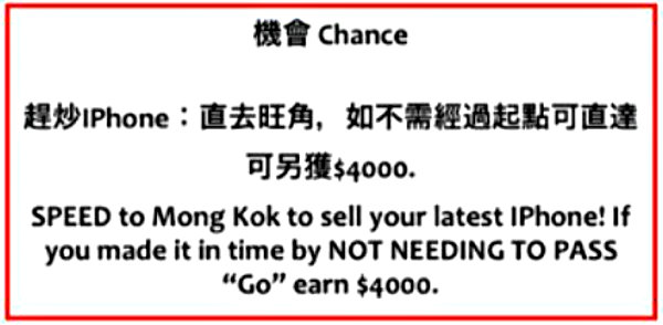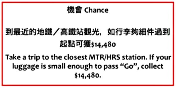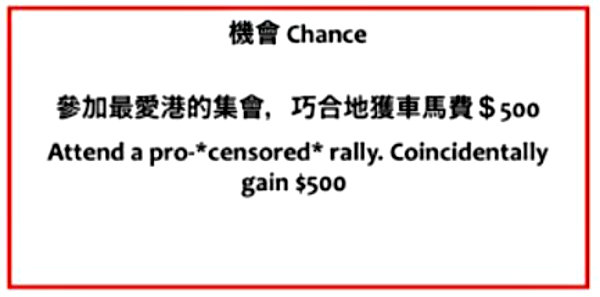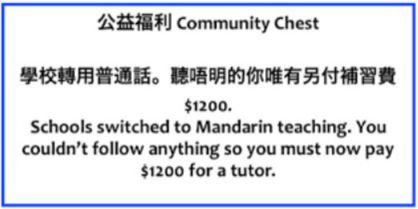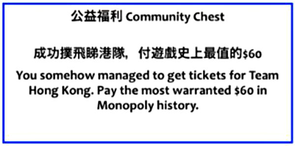 To further extend the tongue-in-cheek theme and move towards making the concept even more amusing, if not actually playable, Cheuk has leaked some of his alternative “Chance” and “Community” cards to Coconuts HK.