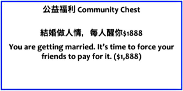 To further extend the tongue-in-cheek theme and move towards making the concept even more amusing, if not actually playable, Cheuk has leaked some of his alternative “Chance” and “Community” cards to Coconuts HK.