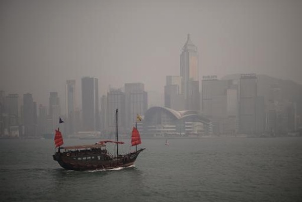 A junk sails past the Hong Kong skyline which is shrouded in a dense blanket of toxic smog