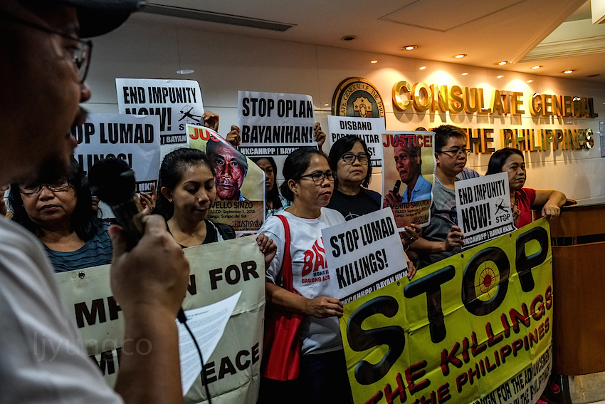 Human rights and peace advocates in Hong Kong picketed the Philippines Consulate General in Admiralty yesterday, condemning the brutal killings of the Lumads (an indigenous people) in Mindanao, southern Philippines, allegedly at the hands of paramilitary groups and security forces.