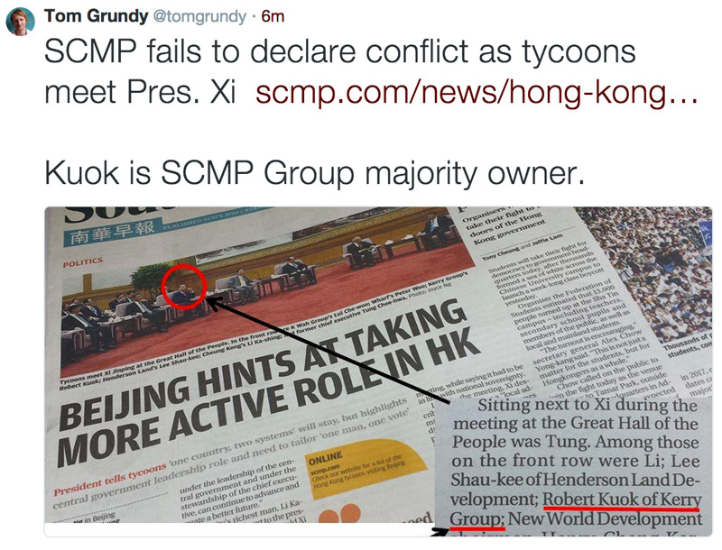 Tom Grundy, the man behind local blog Hong Wrong, has taken to Twitter to complain that the SCMP breached journalistic ethics when they failed to declare their conflict of interest in a story about Hong Kong business tycoons meeting with President Xi Jinping.