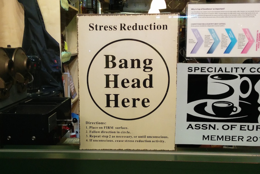 Unearthed by Redditor nanosheep, this stress reduction aid is pinned to a glass wall in the cafe.