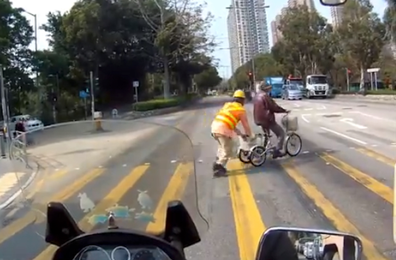 The video, posted to Facebook by local media company on.cc, appears to have been captured by a motorcyclist’s helmet cam, so the two men likely had no idea they were being filmed.