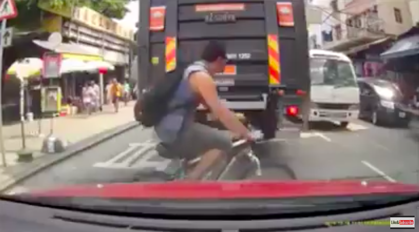 But while crossing a road in Hong Kong as a pedestrian is dangerous, the city’s traffic is equally — if not more — perilous for cyclists, as this clip posted today shows.