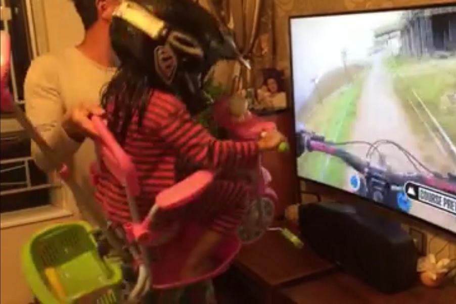 In the video, Chan can be seen holding his young daughter, Wai Wai, in a push tricycle while shaking and turning the toy to match the POV mountain bike ride on their television.