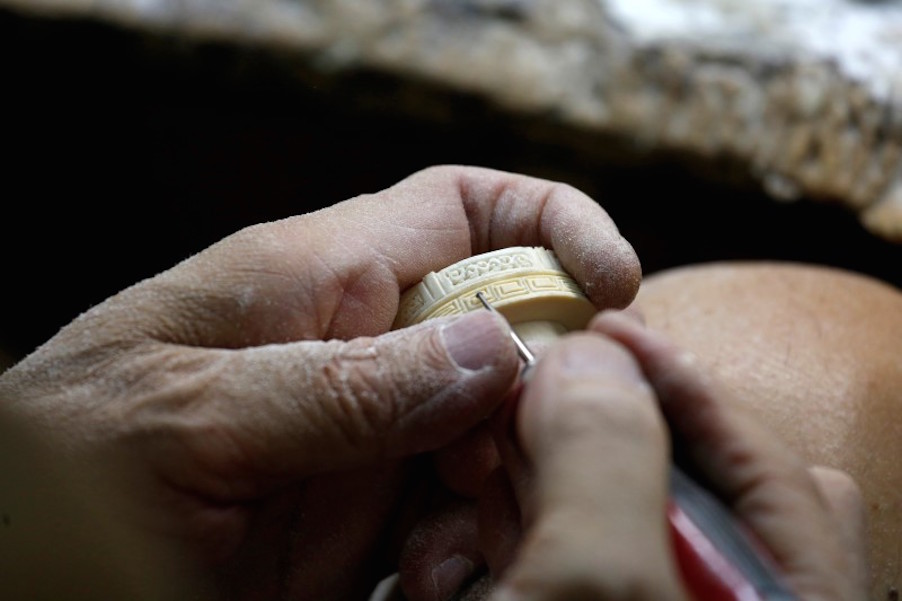 A worker crafts an ivory product from government-registered ivory tusk inside a Hong Kong factory on June 27, 2016. Photo: Bobby Yip/Reuters