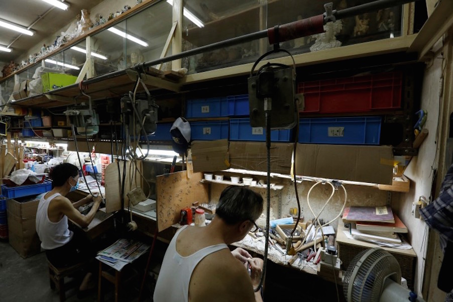 Workers inside a factory crafting registered ivory and mammoth products inside a Hong Kong factory on June 27, 2016. Photo: Bobby Yip/Reuters