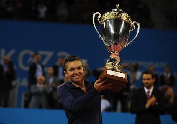 Romania’s Simona Halep celebrates with the cup after winning the WTA Tournament of Champions final against Australia’s Samantha Stosur in Sofia on November 3, 2013