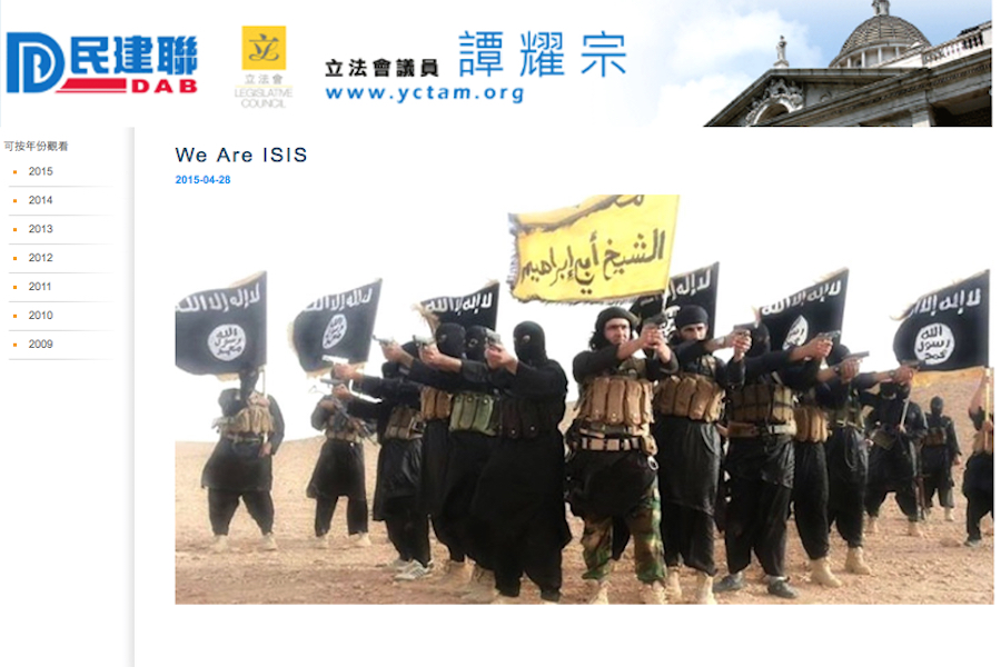Stand News reports that the pro-Beijing LegCo member’s webpage was defaced with a picture of men wielding weapons, with the caption “We are ISIS”.