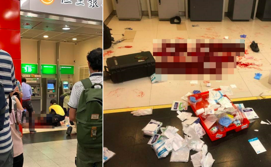 According to reports, three guards who work for the security company Guardforce were walking to the Hang Seng bank ATMs in the MTR station at around 4pm when a man brandished a knife and stabbed one of the guard’s neck.
