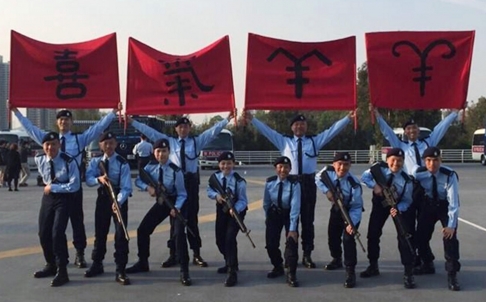 Hong Kong Police have come under fire after a photo of officers brandishing weapons for an apparently jokey Chinese New Year greeting went viral.