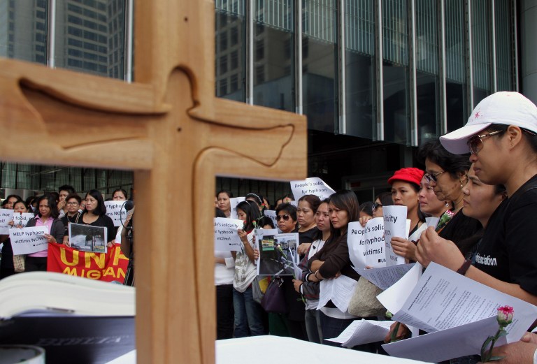 Hong Kong’s Filipino domestic workers made emotional pleas Sunday to citizens of the wealthy city to give generously to their typhoon-ravaged homeland, as hundreds attended memorial services to seek comfort in prayer.