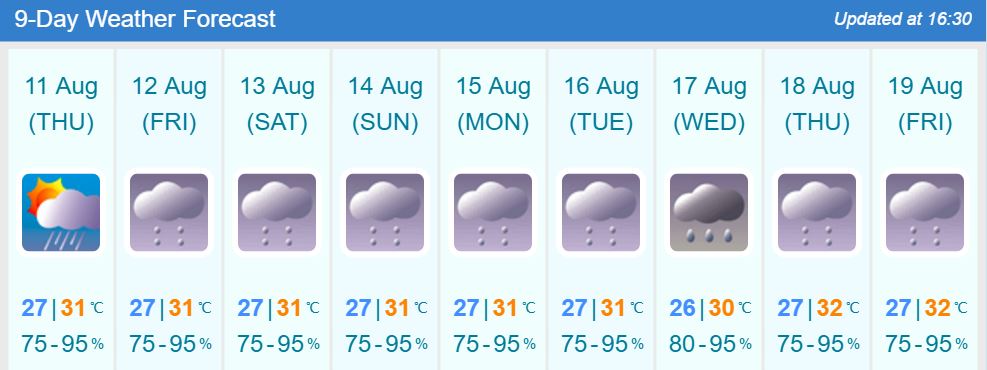 According to the Observatory, a trough of low pressure is bringing showers to Hong Kong over the next few days. The HKO forecast the development of a tropical cyclone between the northern part of the South China Sea and the western North Pacific at the beginning of next week, but it remains unclear where the cyclone will form and subsequently move towards.