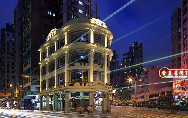 Built in 1931 by local architect W. H. Bourne, the traditional four-storey tong lau successfully integrated the Chinese and Western architectural styles prevalent in the early 20th century. Like all tong laus, the ground floor of the structure was designated as a retail area while the upper floors served residential purposes. The building now operates as the Hong Kong Baptist University School of Chinese Medicine.