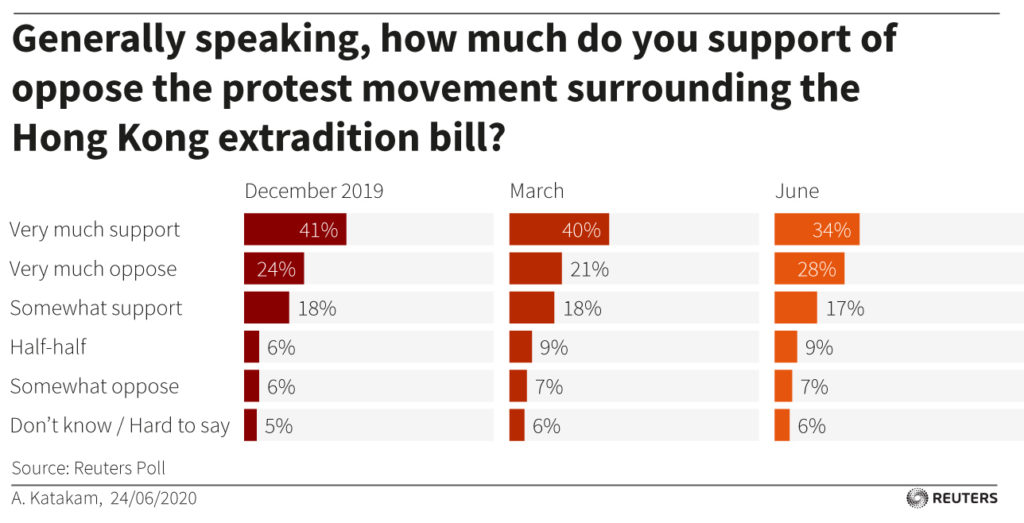 Fewer people support Hong Kong’s anti-government protests and think authorities should accede to the movement’s demands compared to before, according to the results of a Reuters poll published Friday.