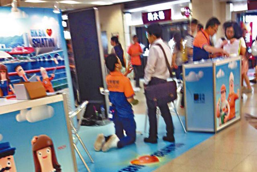 A desperate Hong Kong Broadband Network (HKBN) employee yesterday evening resorted to kneeling in front of a potential customer at a booth in Sha Tin’s New Town Plaza. Naturally someone was there to take a photo and put it on the interwebz.