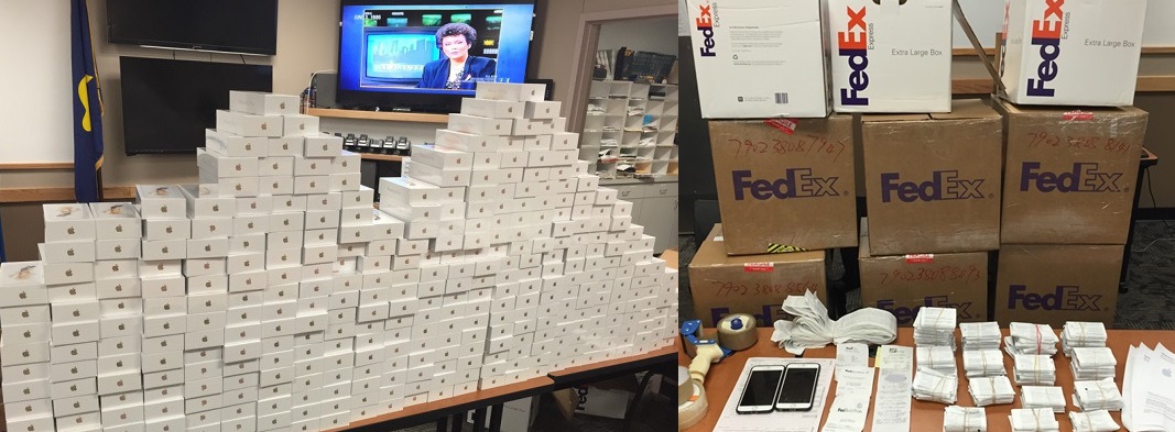 The investigators then headed to a nearby FedEx office, where they discovered a number of boxes filled with iPhones that were waiting for shipment to Hong Kong.