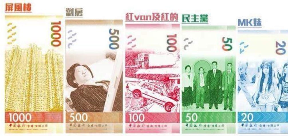 Among them, this one, showing residential tower blocks on a HK$1,000 note; an oft-photoshopped picture of pro-Beijing lawmaker Regina Ip squeezing into a coffin home for the HK$500; an overturned red minibus and crashed taxi for the HK$100; the Democratic Party for the HK$50 note, and an “MK girl” — slang term for a young woman in Hong Kong who blindly follows trends — for the HK$20.