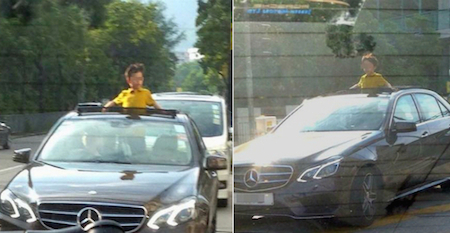Hong Kong netizens were shocked this week when pictures circulated on the internet of a young boy having the time of his life with his delicate little head and tiny little shoulders stuck out of the sunroof of a Mercedes Benz.
