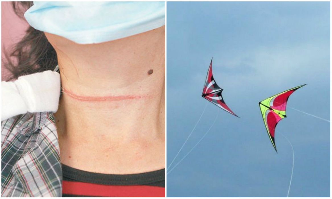 A woman has been left shaken and scarred after being sliced by the string of a “stunt kite” in Tai Po this weekend.