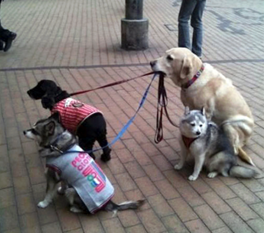 So it’s definitely a rare sight to see this adorable Labrador so well-trained outside a store in Hong Kong – the Lab is definitely the boss, literally has all the other dogs on a tight leash!