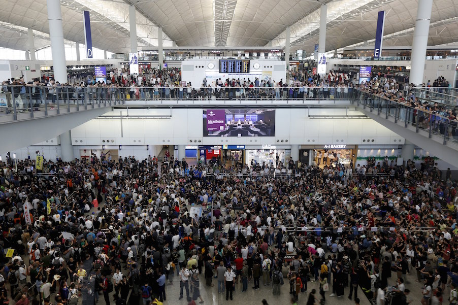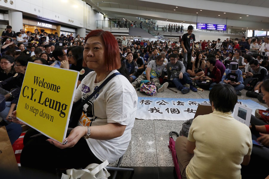 Chanting “Safeguard the sky of Hong Kong” and holding signs demanding Leung step down, the protesters staged a three-hour sit-in as international travelers streamed by at one of Asia’s busiest aviation hubs.