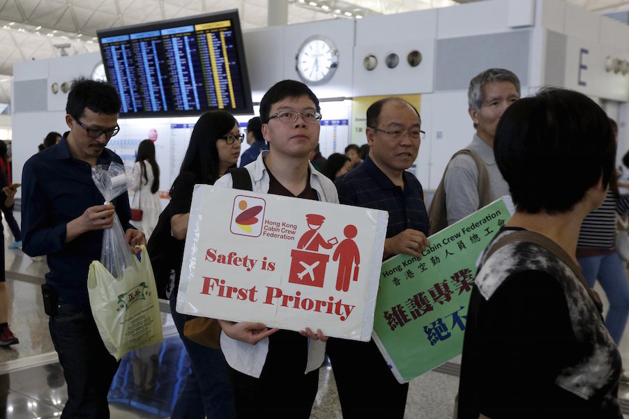 “It’s not fair asking frontline staff to bring in something (to the airport’s restricted area) which is unidentified or unattended for a period of time,” said Dora Lai, a senior member the Hong Kong Cabin Crew Association, which organised the protest.